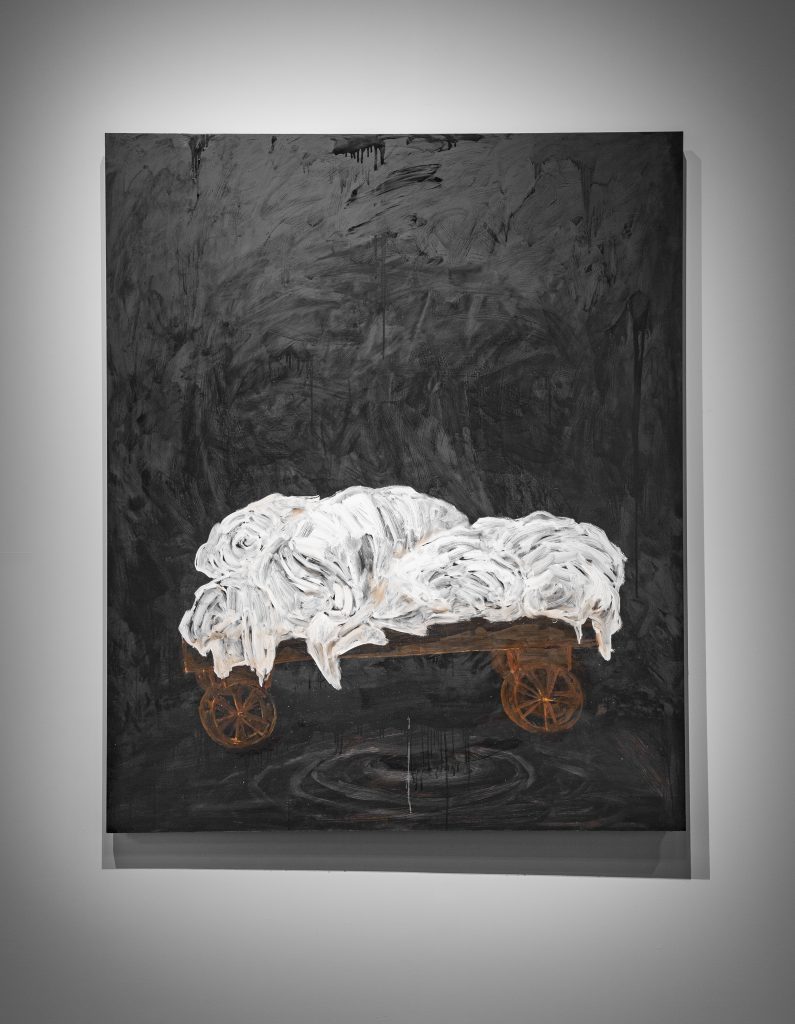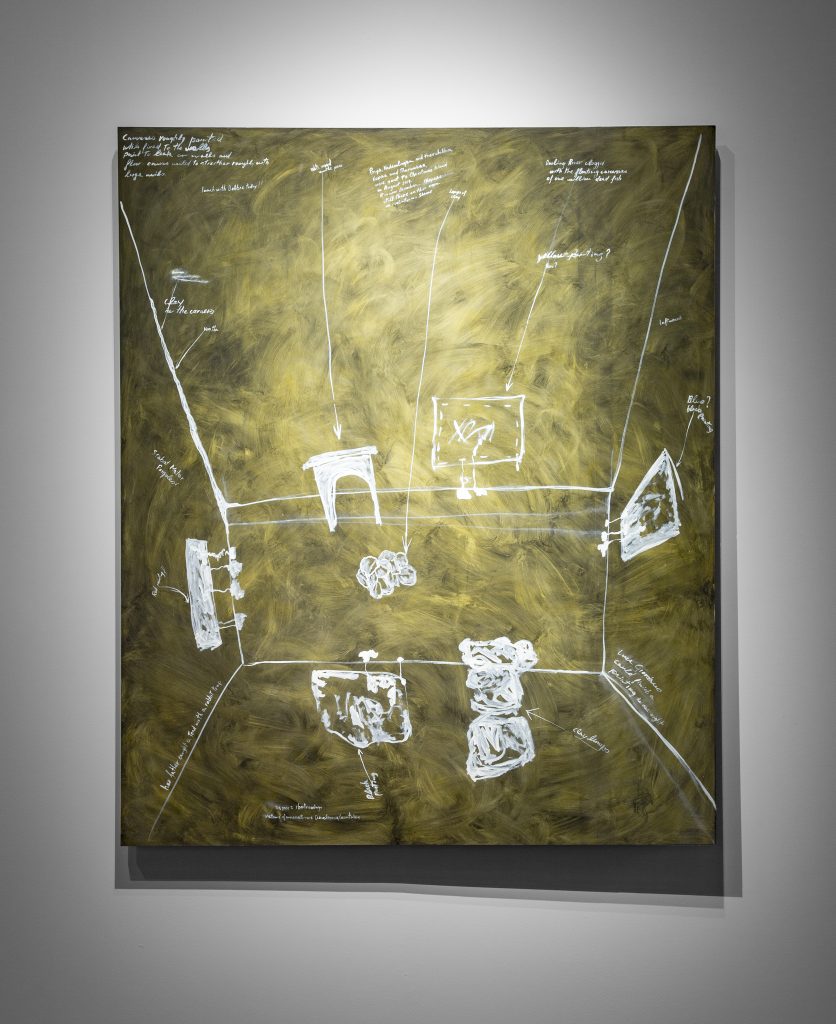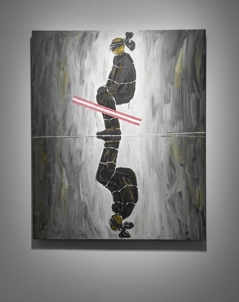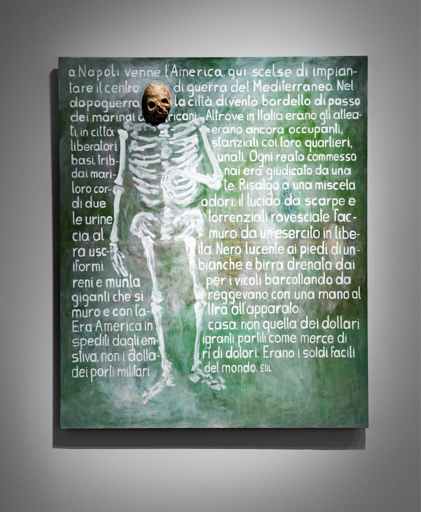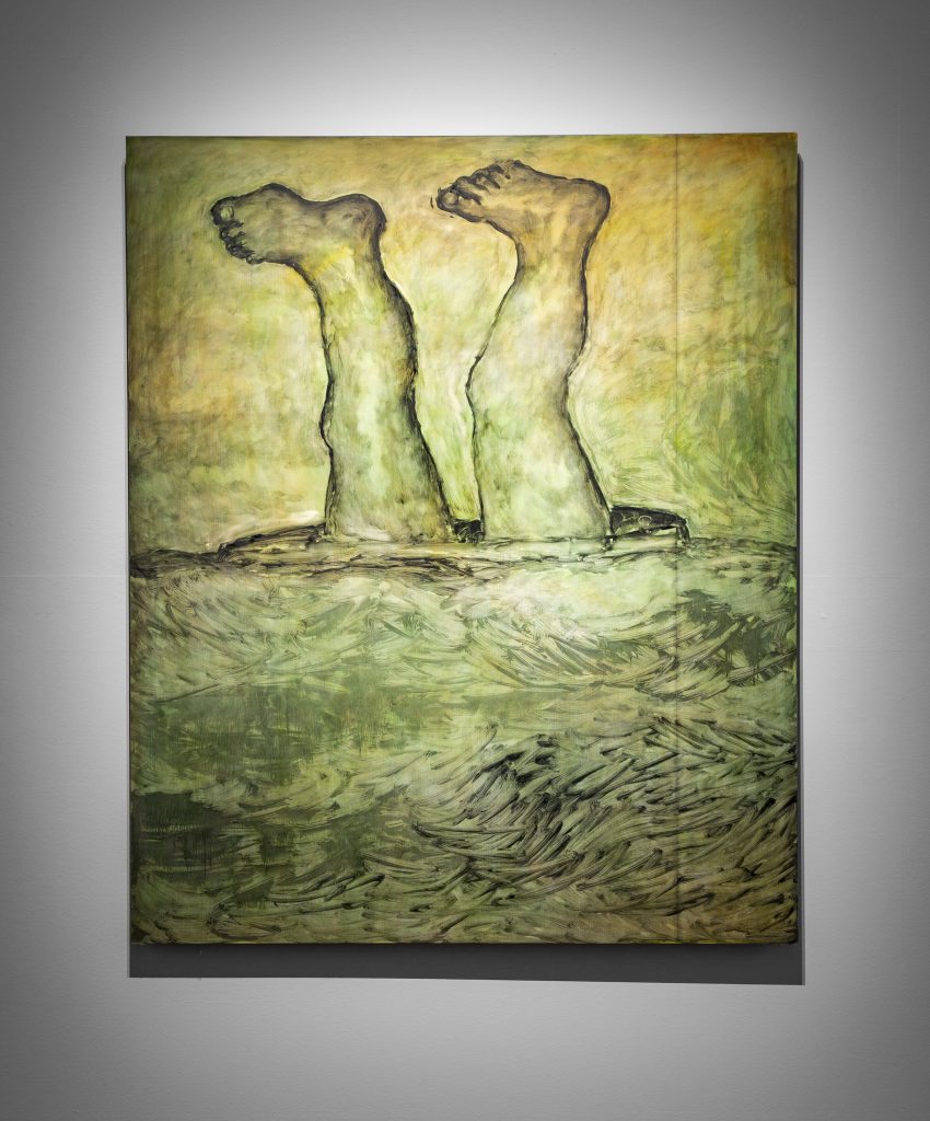 From the Biennale catalogue: “The seven paintings of The Raft (2019) are rumination on memory. Via Egiziaca a Pizzofalcone n.74, Quartiere San Ferdinando, Napoli, describes an early encounter with American soldiers in a post-WWII occupied Naples; “I go back to a mixture of two smells: shoe polish and beer-soaked urine…” The fragmented body is also a recurring motif. With flailing legs drowning at sea, Iacobelli’s Spanish-titled painting loosely translates to describe an upside-down world in which countries guarding global peace are also the greatest manufacturers and international exporters of weapons. “The world economy is the most efficient expression of organised crime” (2020) features not only nightmarish dismembered hands and feet but a cartoon thumbs down vaguely reminiscent of a Facebook “dislike”. Iacobelli’s installation is an atmospheric form of social realism; his critique of global power structures is channelled through elusive imagery and turpentine-washed surfaces.”